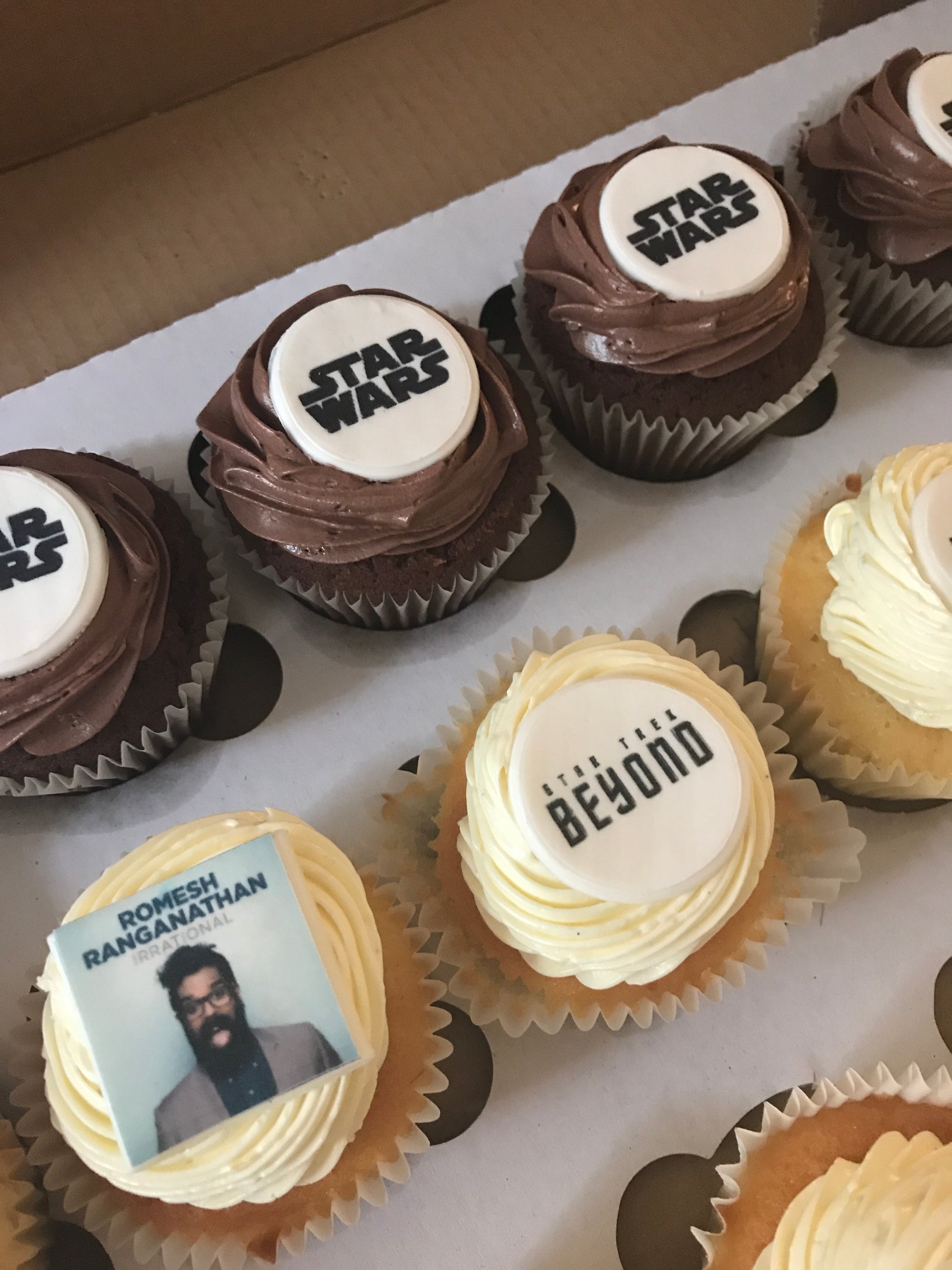 Each cupcake is topped with an edible logo/photo, sitting on top of a silky Swiss meringue buttercream.